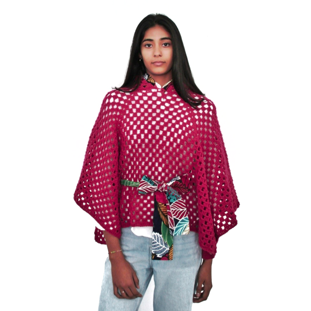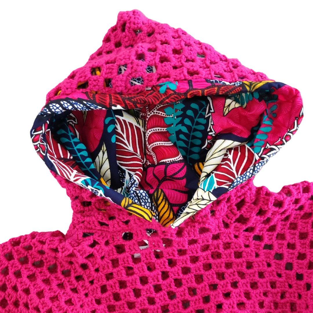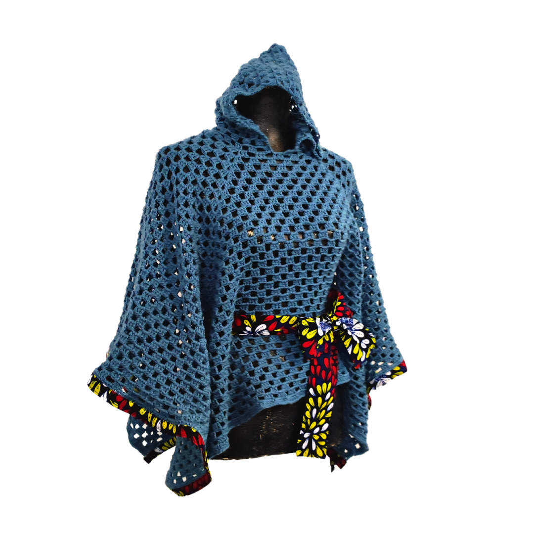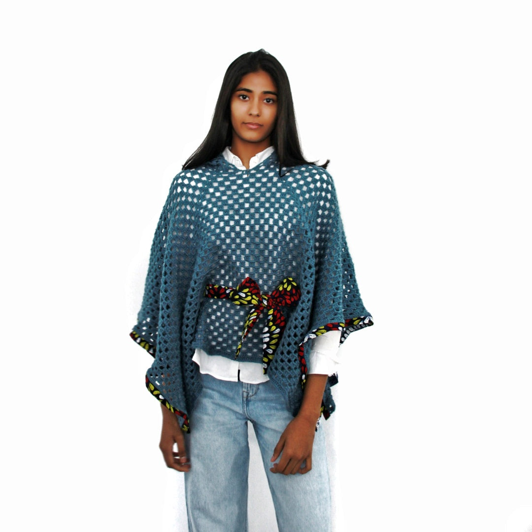 Poncho em crochet com detalhes em capulana.