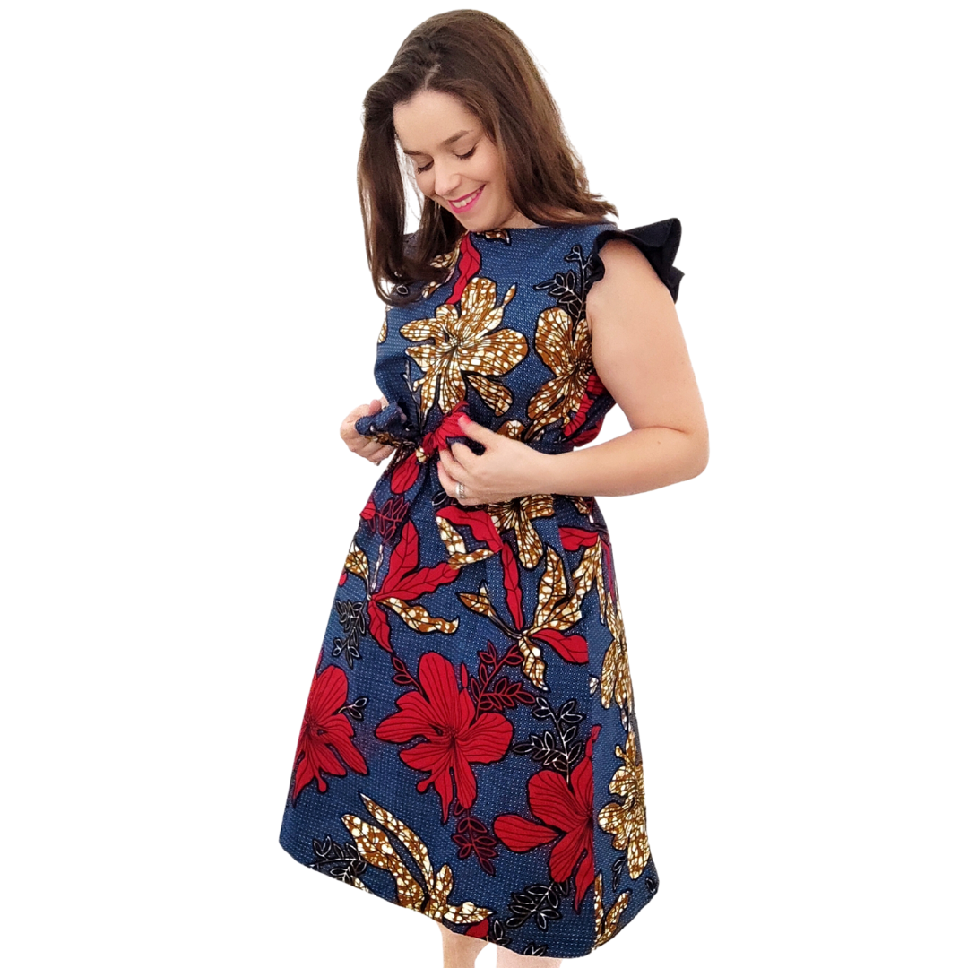 Vestido e cinto em capulana, com folhos em tecido de algodão.